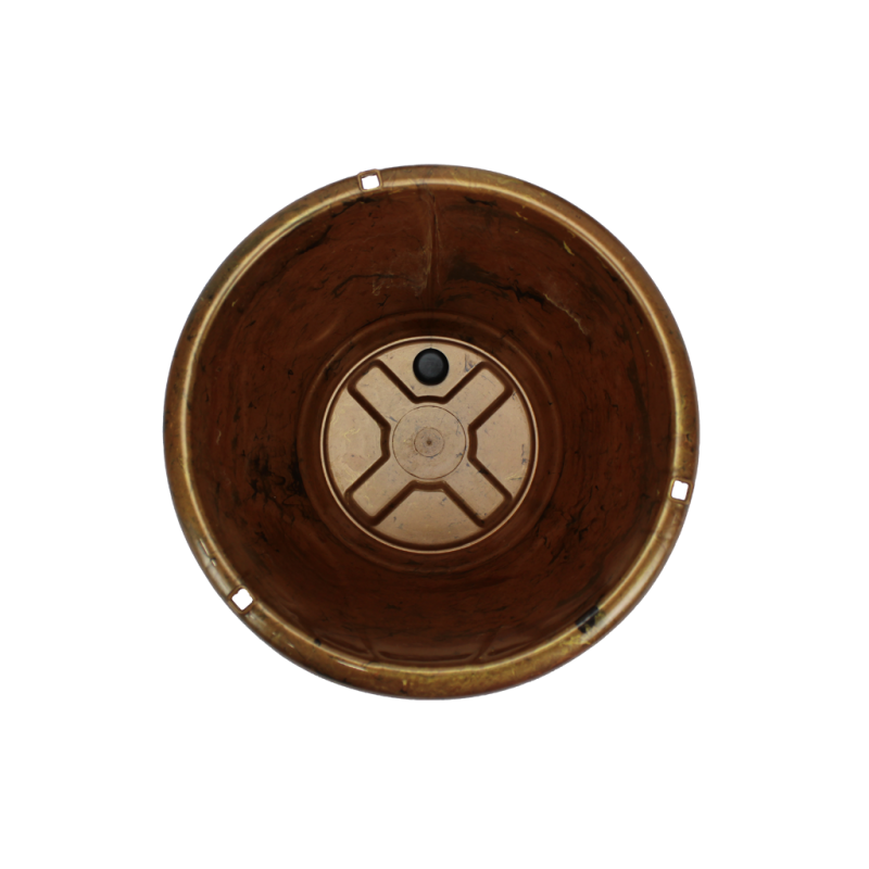 Seu acabamento é liso e em alto brilho; sua borda tem três perfurações com a finalidade de engate da haste, oferecendo mais segurança, resistência e sofisticação ao pendurar suas plantas.