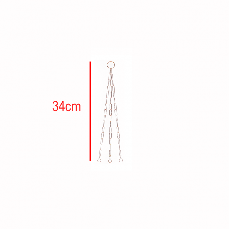 O produto possui o seu design uma argola na parte superior para pendurar e três correntes com um gancho em cada extremidade.