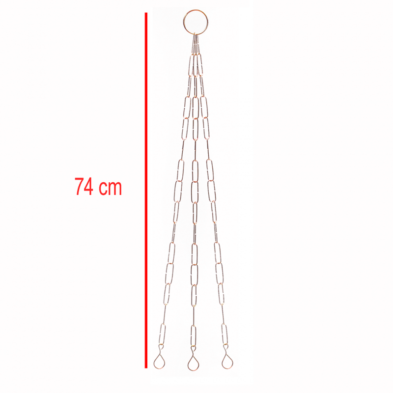 O produto possui o seu design uma argola na parte superior para pendurar e três correntes com um gancho em cada extremidade.