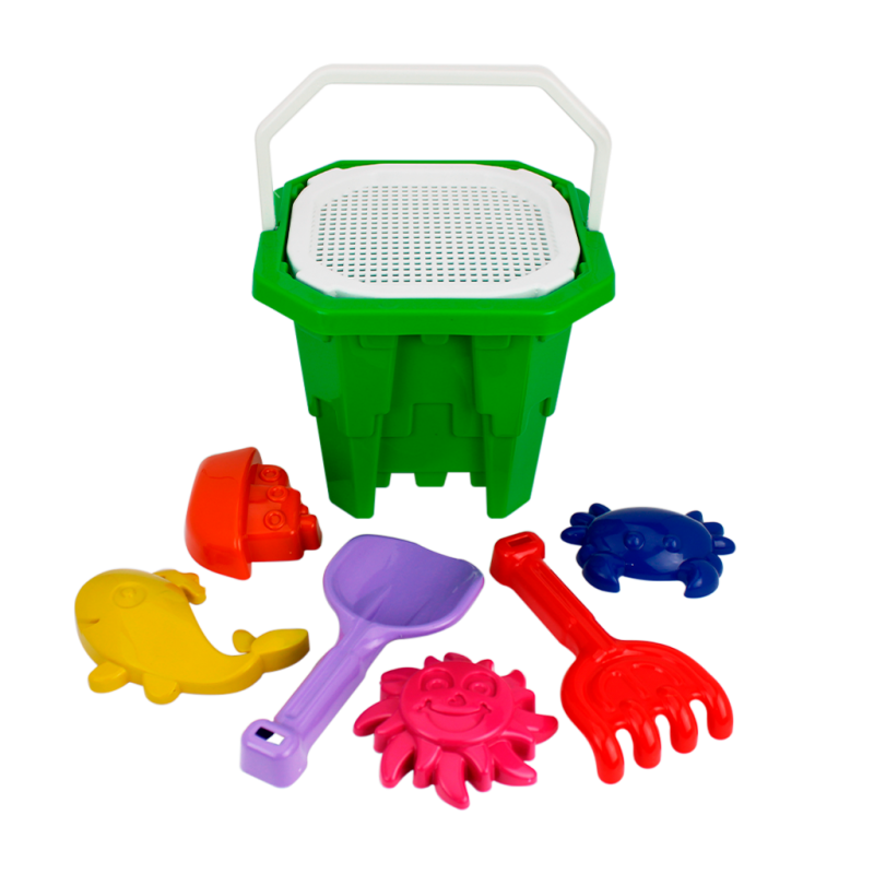 O Baldinho Quadrado é perfeito para se divertir brincando na areia da praia, ele acompanha 01 Peneira, 01 Pazinha, 01 Mini Rastelo e 4 forminhas nos formatos de: Peixe, Siri, Tartaruga e Navio. Todos entregues em cores sortidas.