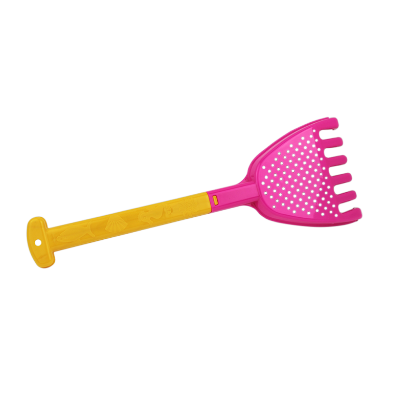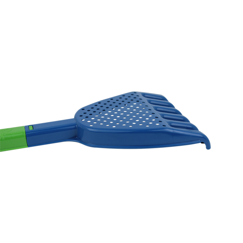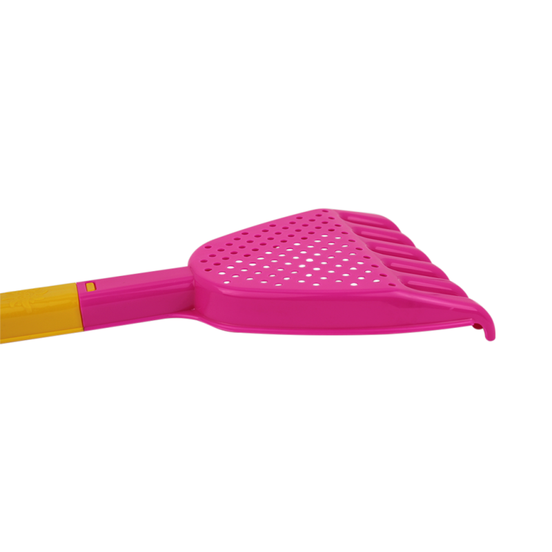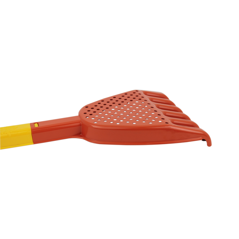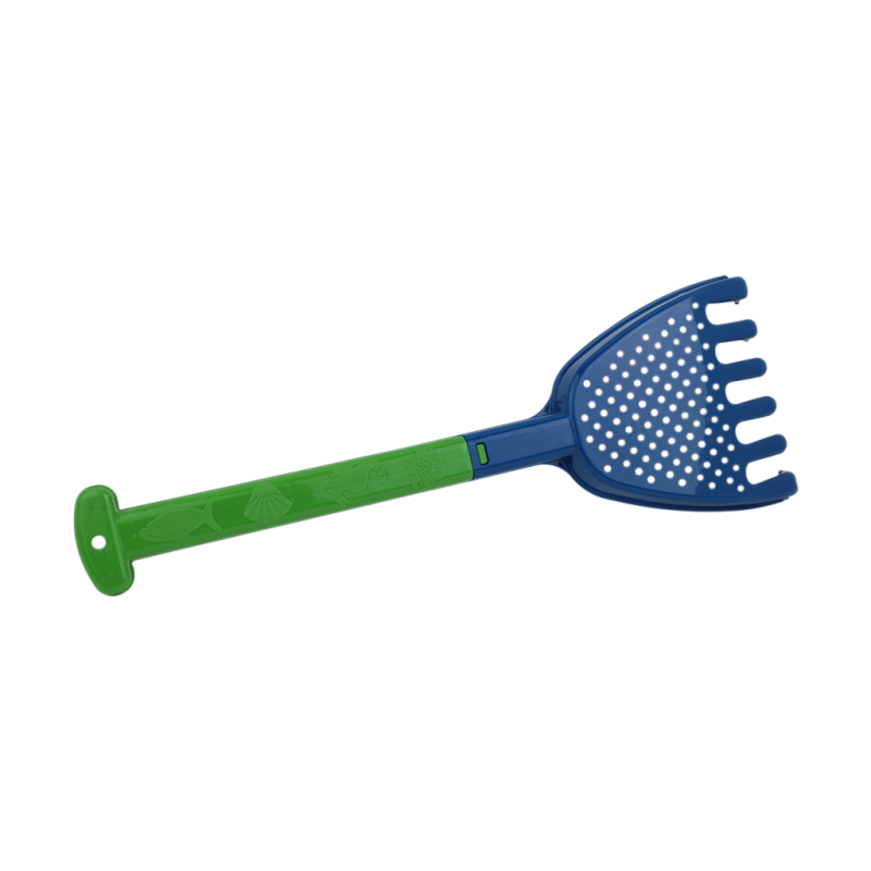 Já o rastelo além de possuir também desenhos em alto relevo no cabo, e possuir cores vibrantes, também possui 6 resistentes “dentes” em sua ponta, possibilitando que a criança possa arrastar consigo o máximo possível de areia ou terra que estiver no caminho. Possui também em sua ponta um apoio para facilitar o manuseio pela criança.