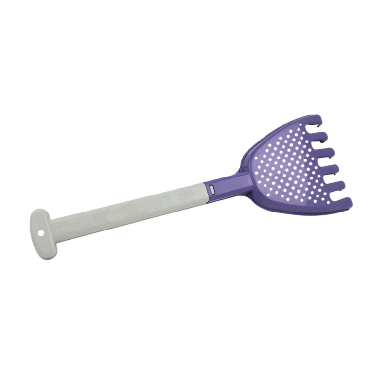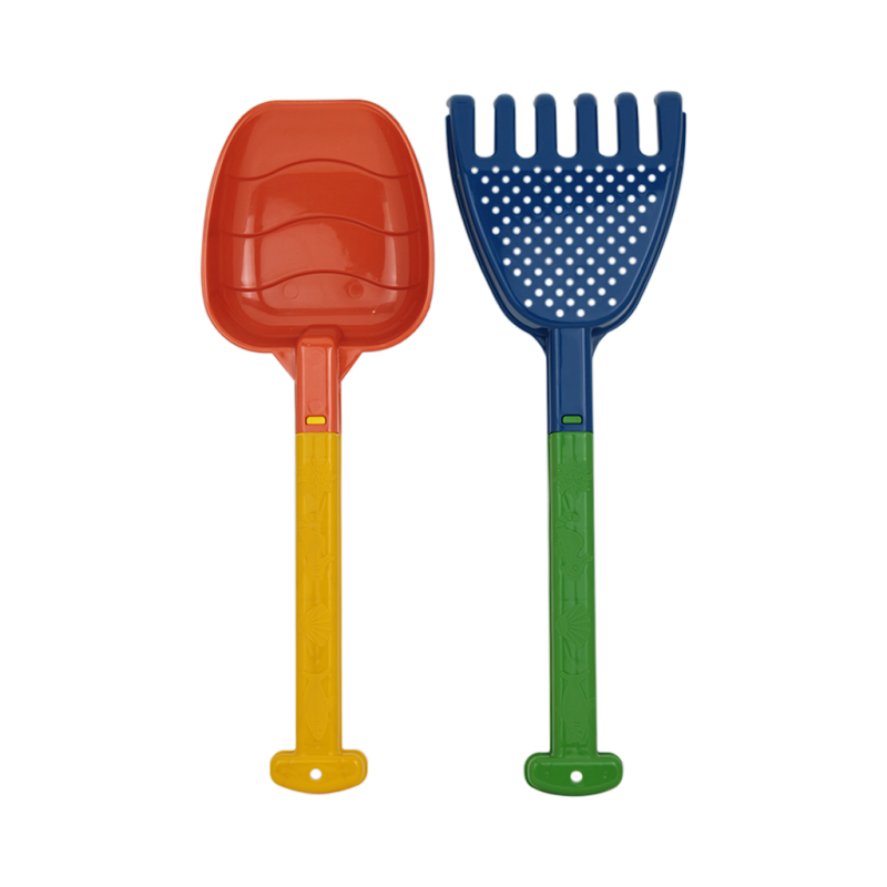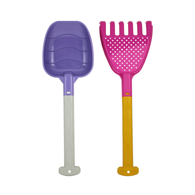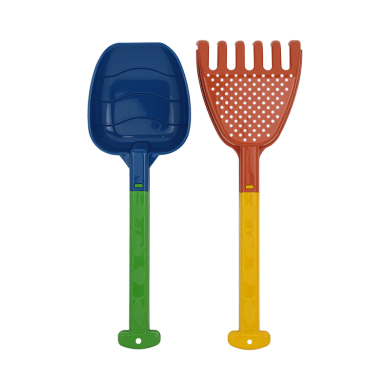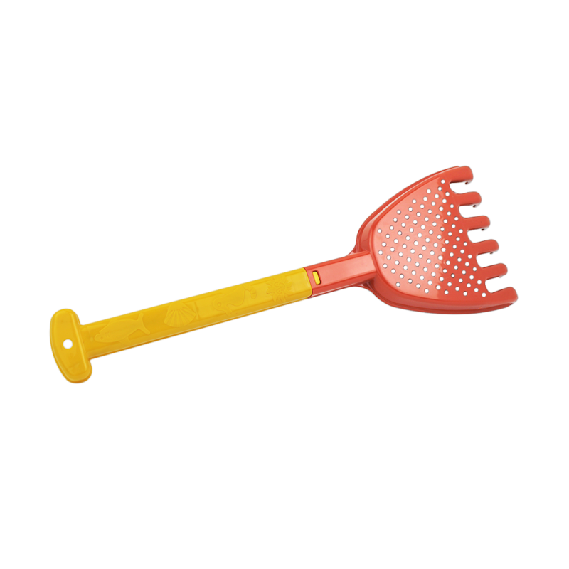 Já o rastelo além de possuir também desenhos em alto relevo no cabo, e possuir cores vibrantes, também possui 6 resistentes “dentes” em sua ponta, possibilitando que a criança possa arrastar consigo o máximo possível de areia ou terra que estiver no caminho. Possui também em sua ponta um apoio para facilitar o manuseio pela criança.